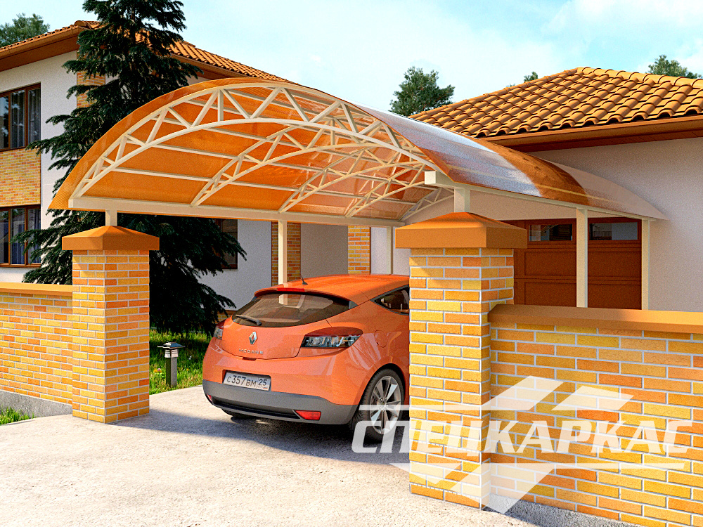 Компания «Спецкаркас» предлагает козырьки, беседки, навесы из поликарбоната любого типа и формата: одно- и двухскатные, прямые и наклонные, арочные и даже куполообразные.